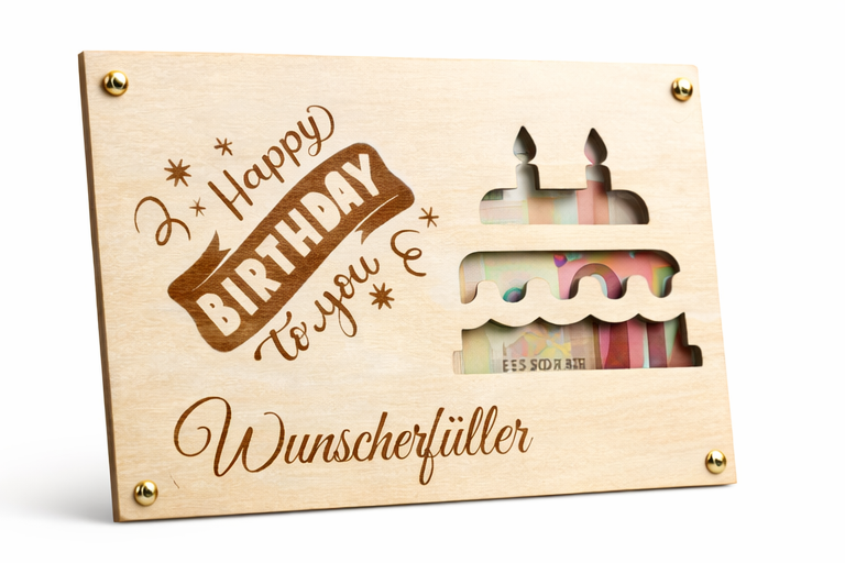 Die Sichtbarkeit der Geldscheine erfolgt ausschließlich durch die ausgeschnittene Torte im rechten Bereich des Produkts. Das Motiv zeigt eine mehrstöckige Geburtstagstorte mit Kerzen, durch deren Aussparungen der eingelegte Geldschein sichtbar wird. Ergänzt wird das Design durch den Schriftzug „Happy Birthday to you“ sowie die zusätzliche Textgravur „Wunscherfüller“.