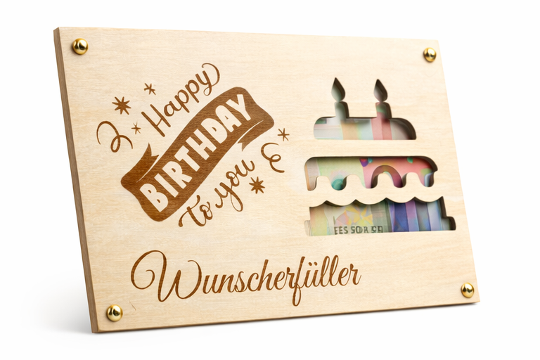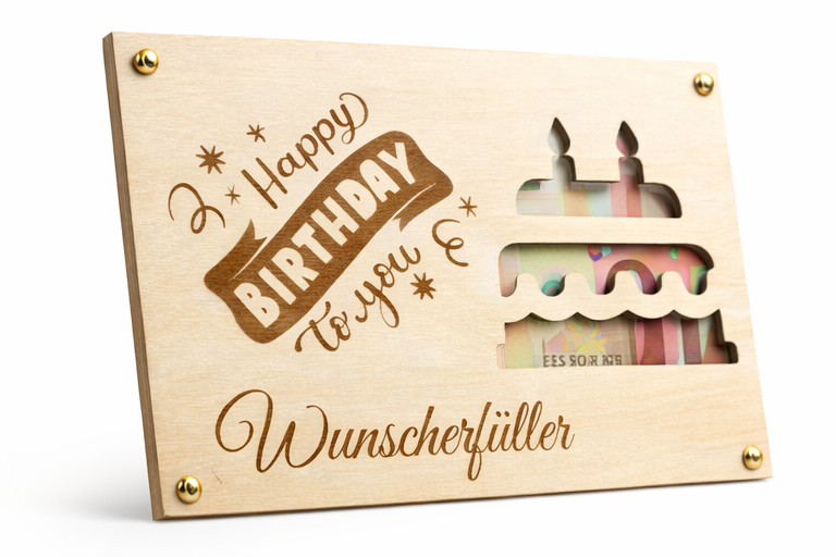 Dieses Geldgeschenk zum Geburtstag besteht aus zwei passgenauen Holzplatten aus Birkensperrholz, die an den vier Ecken mit Rundkopfklammern miteinander verbunden sind. Zwischen den beiden Platten können ein oder mehrere Geldscheine eingelegt werden. Die Geldscheine liegen lose zwischen den Platten und sind nicht geklebt oder fixiert.