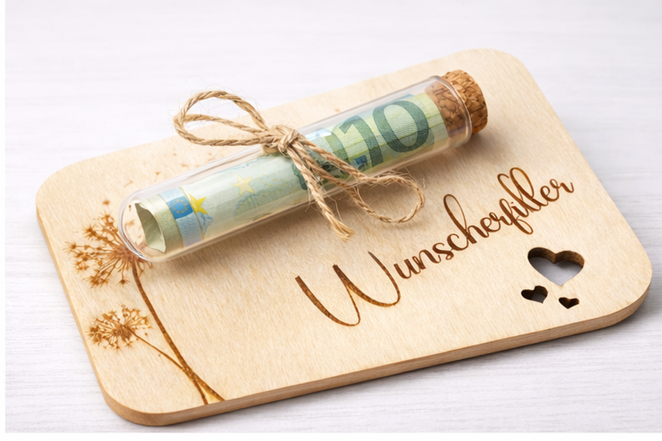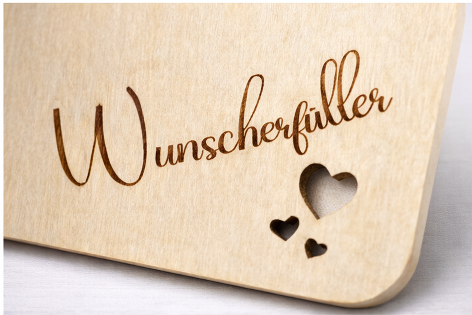 Dieses besondere Geldgeschenk kombiniert natürliche Materialien mit einer kreativen Präsentation. Die Basis bildet eine Holzplatte mit abgerundeten Ecken, gefertigt aus Birkensperrholz. Auf der Vorderseite ist der Schriftzug „Wunscherfüller“ dauerhaft eingraviert und wird durch feine florale Motive sowie ausgeschnittene Herzformen ergänzt.
