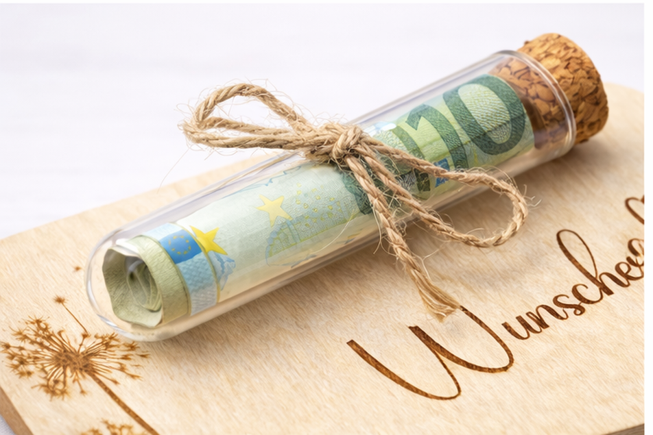 Liebevoll gestaltetes Geldgeschenk aus Holz mit Glasröhrchen. Geldschein wird dekorativ im Reagenzglas überreicht – ideal für besondere Anlässe.