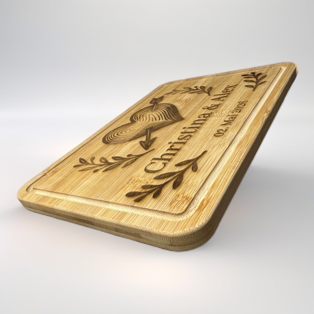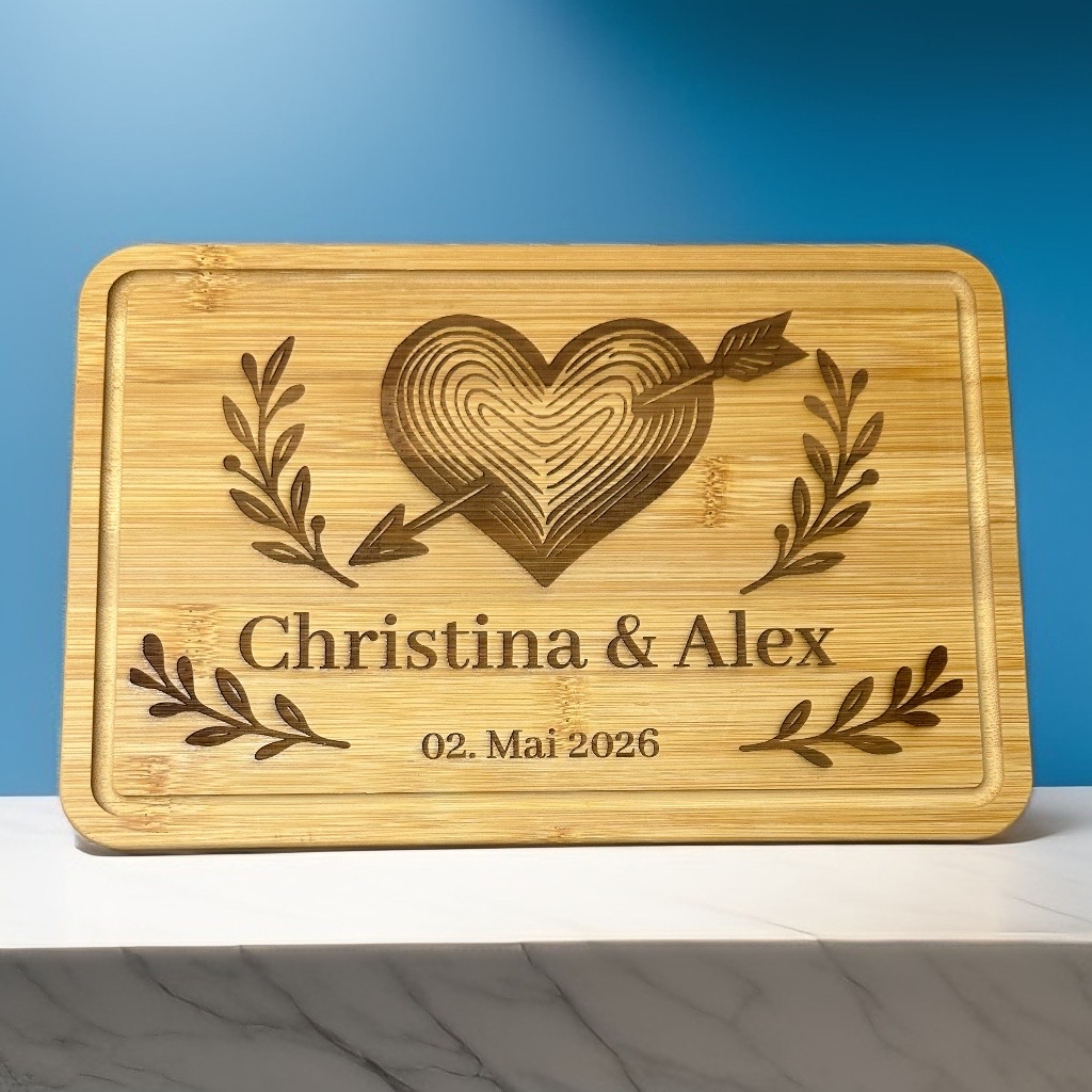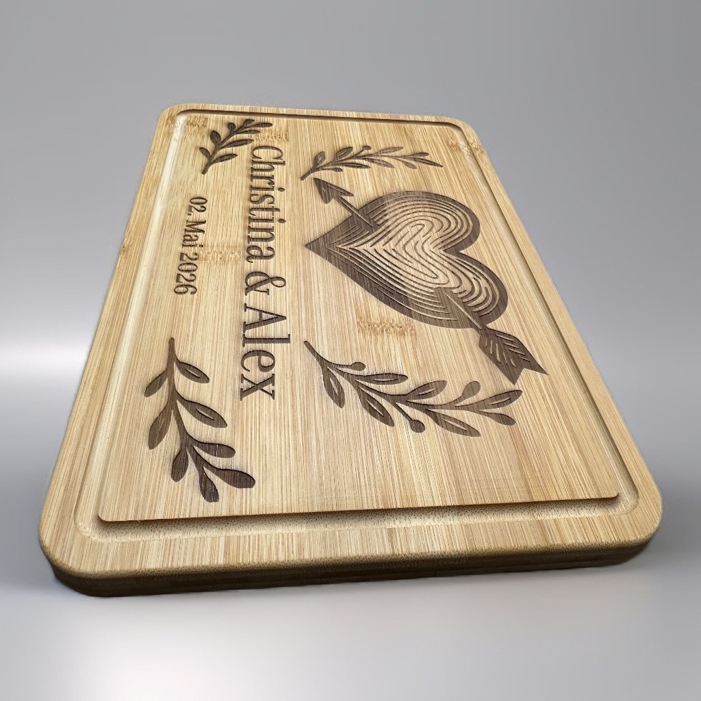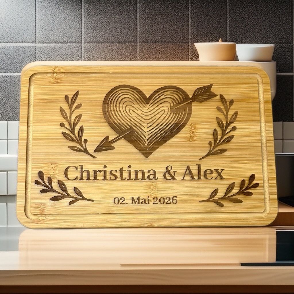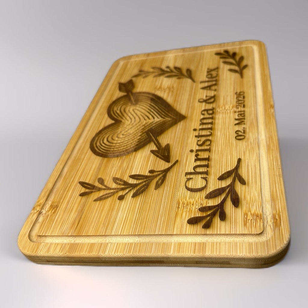 Hochwertiges Schneidebrett aus Bambus mit Saftrille (29 × 19 × 1,5 cm) – personalisierbar mit zwei Namen und Datum. Ideal als Hochzeitsgeschenk, Jahrestagsgeschenk oder individuelles Küchenbrett mit Gravur.